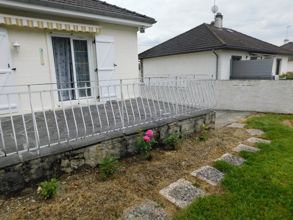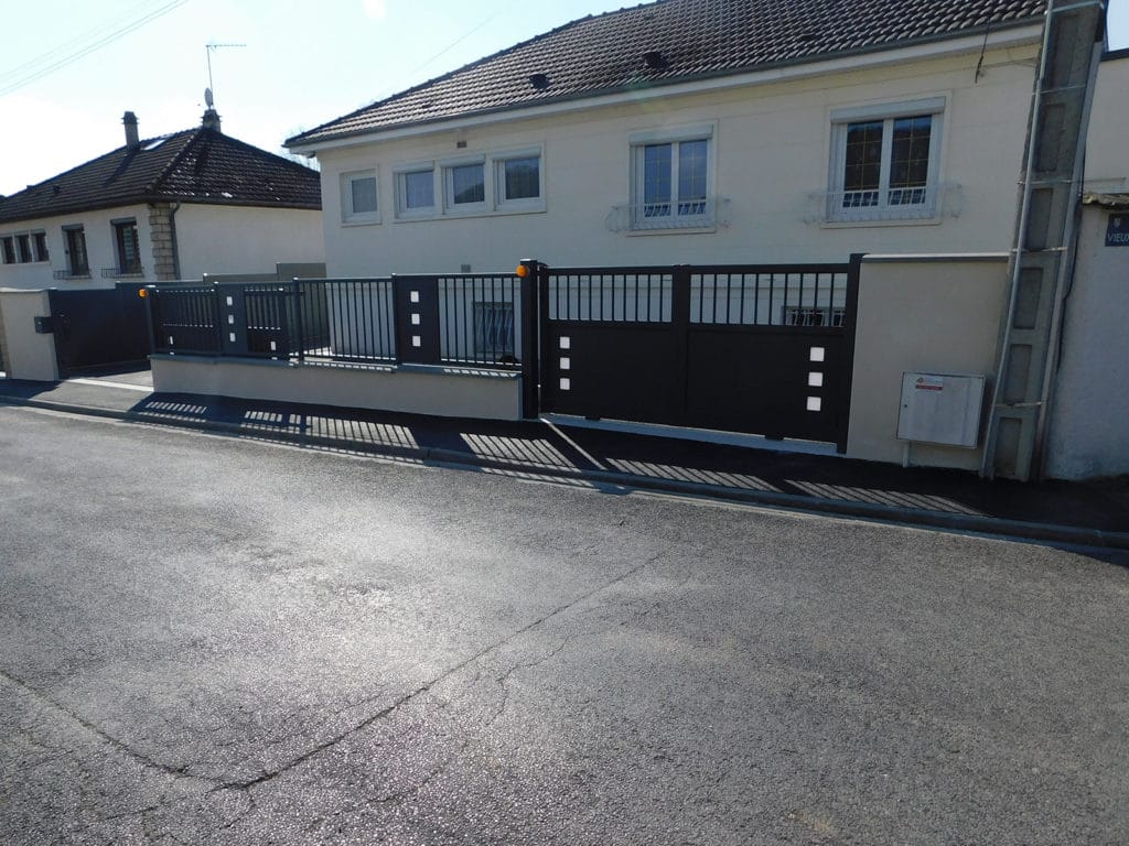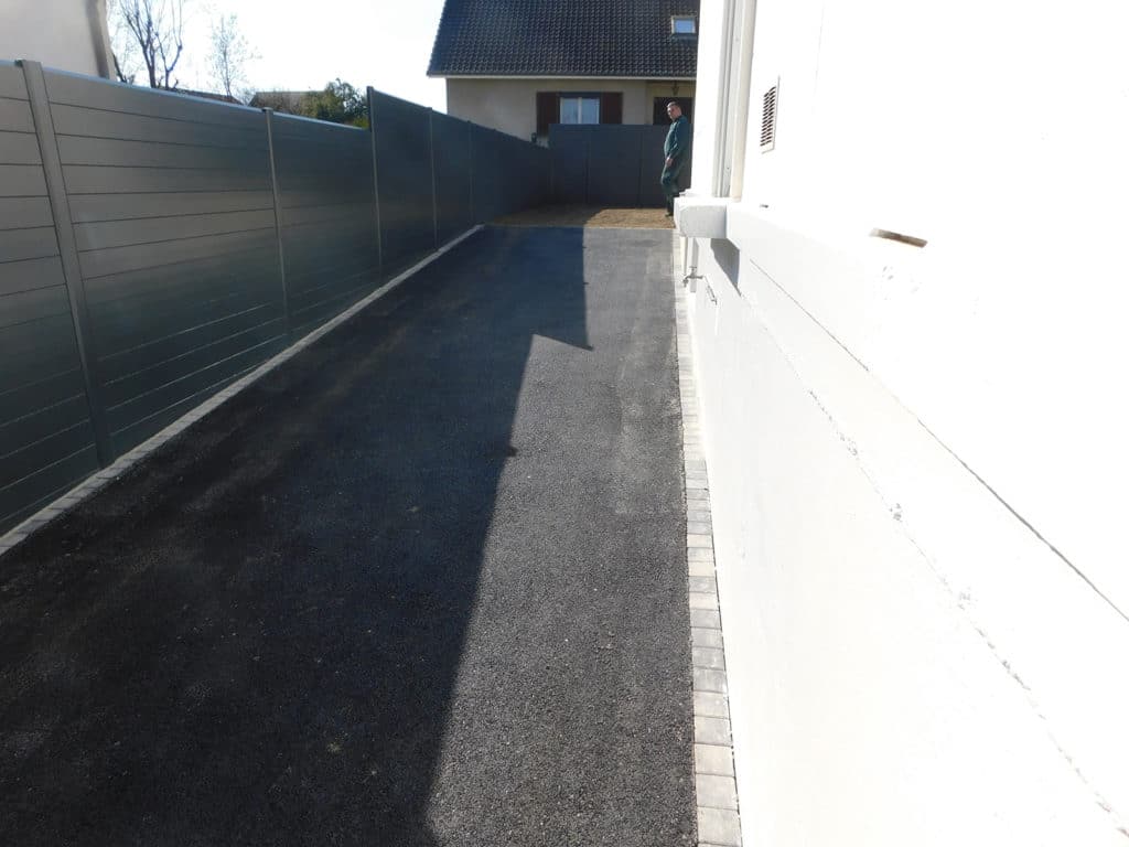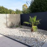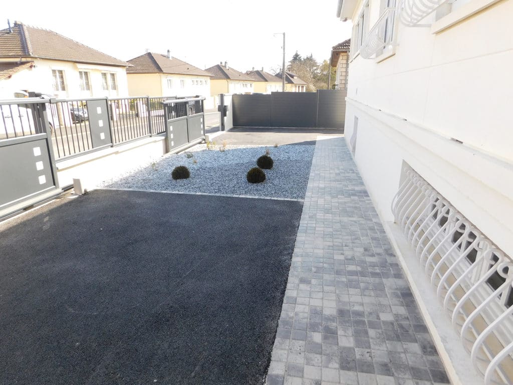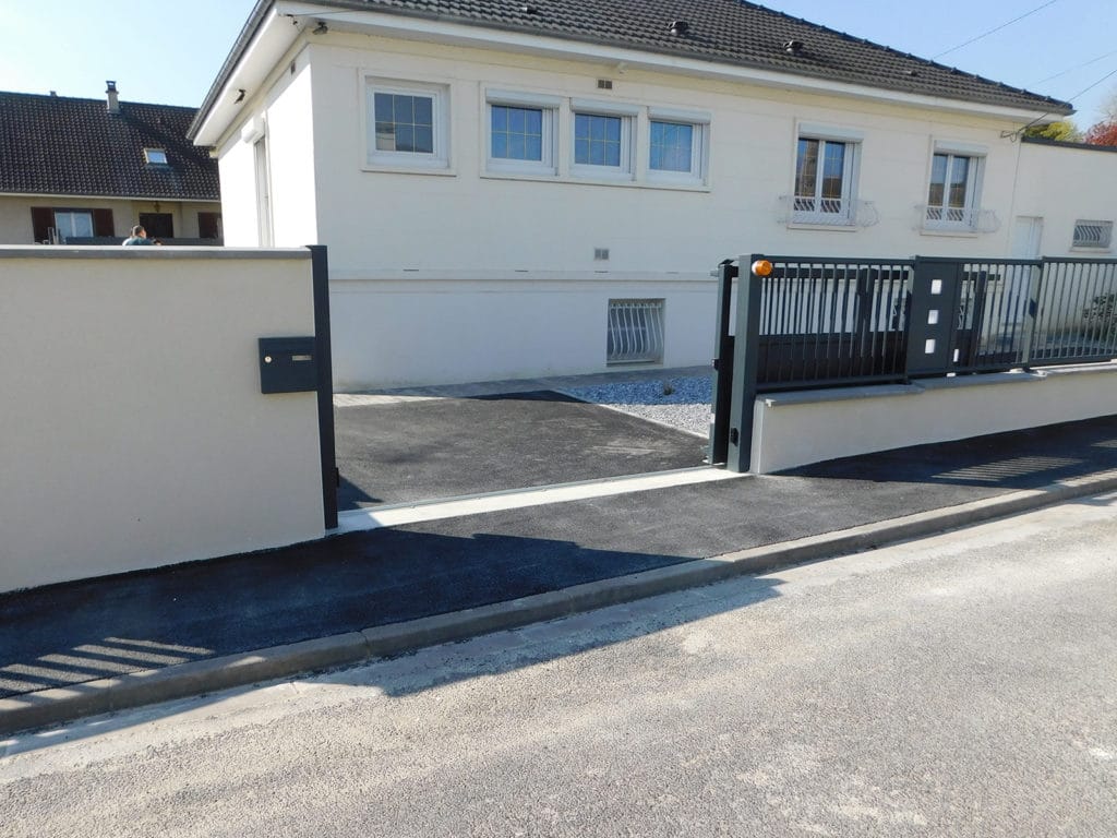 Mise en place d’un portail coulissant et clôture, aménagement d’un massif minéral avec allée en pavés « dune nuancé », palissade et montée en enrobé noir à chaud et création d’un espace détente avec terrasse en grès cérame à l’arrière de la maison .
