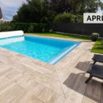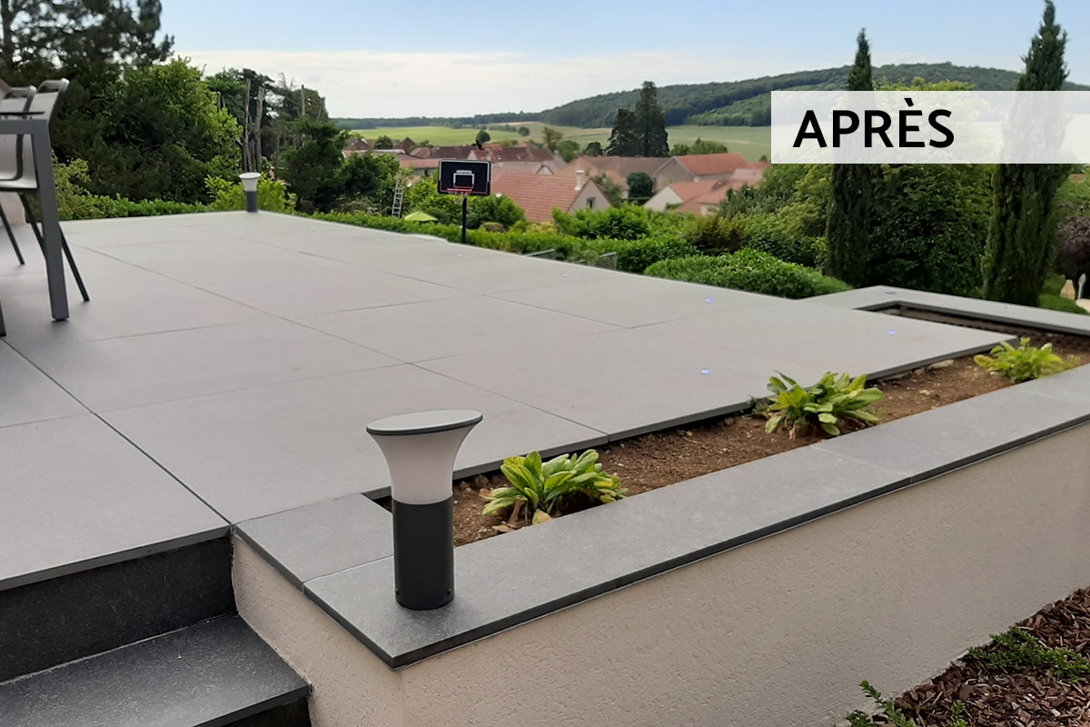 Rénovation et agrandissement de la terrasse en grès cérame couleur gris en carreau de 90 x 90 cm.
