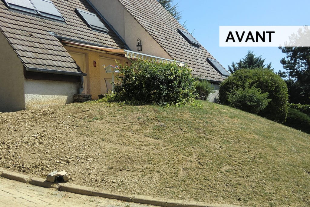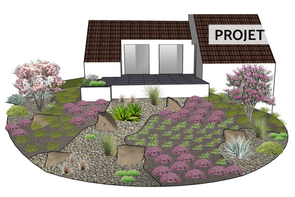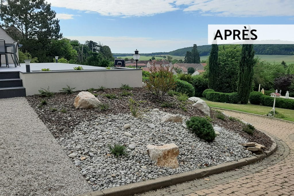 Aménagement de la butte pour réduire l’entretien avec des paillages différents (Écorce, galets de rivière et roche) et des végétaux couvrants.