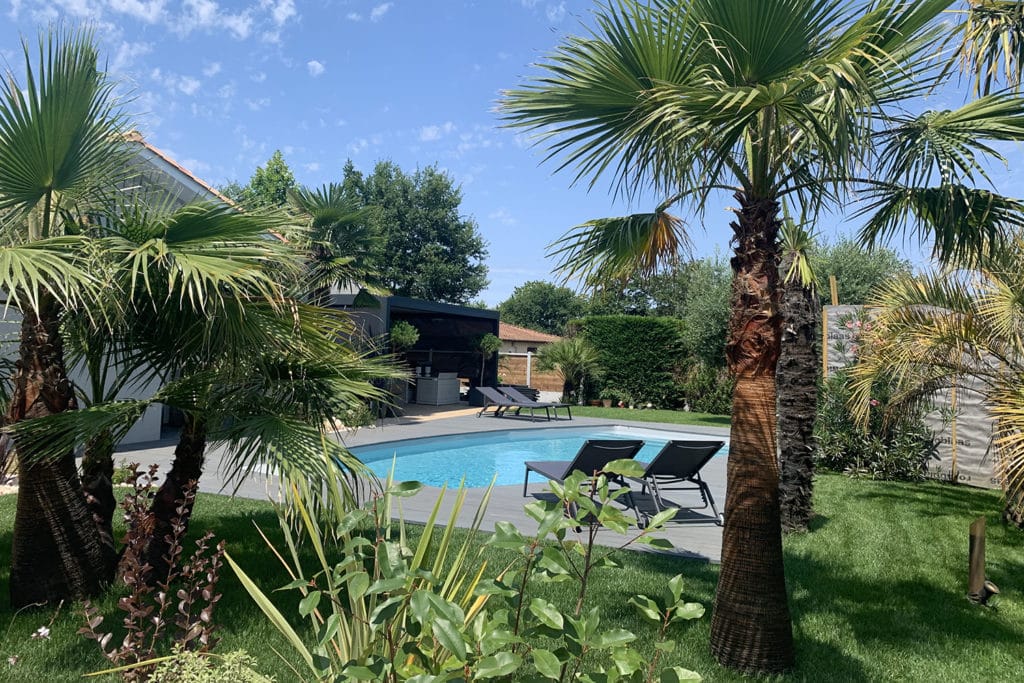 Création réalisée pour l'été 2020 avec la réalisation d'une terrasse en millboard, la plantation d'un olivier et de plusieurs palmiers, et la pose d'un gazon...