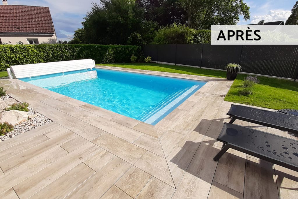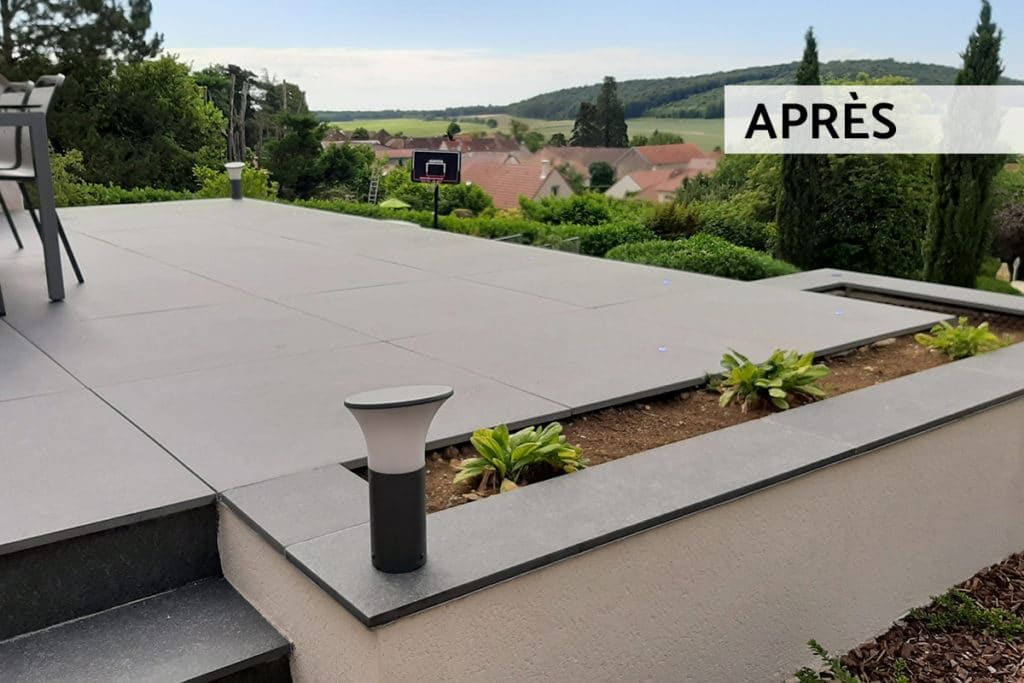 Notre client a été accompagné par Lauréline Chavanet pour la réalisation d'une terrasse en grès cérame imitation bois, en Saône-et-Loire. Lantana Paysage Beaune - Cornuet...