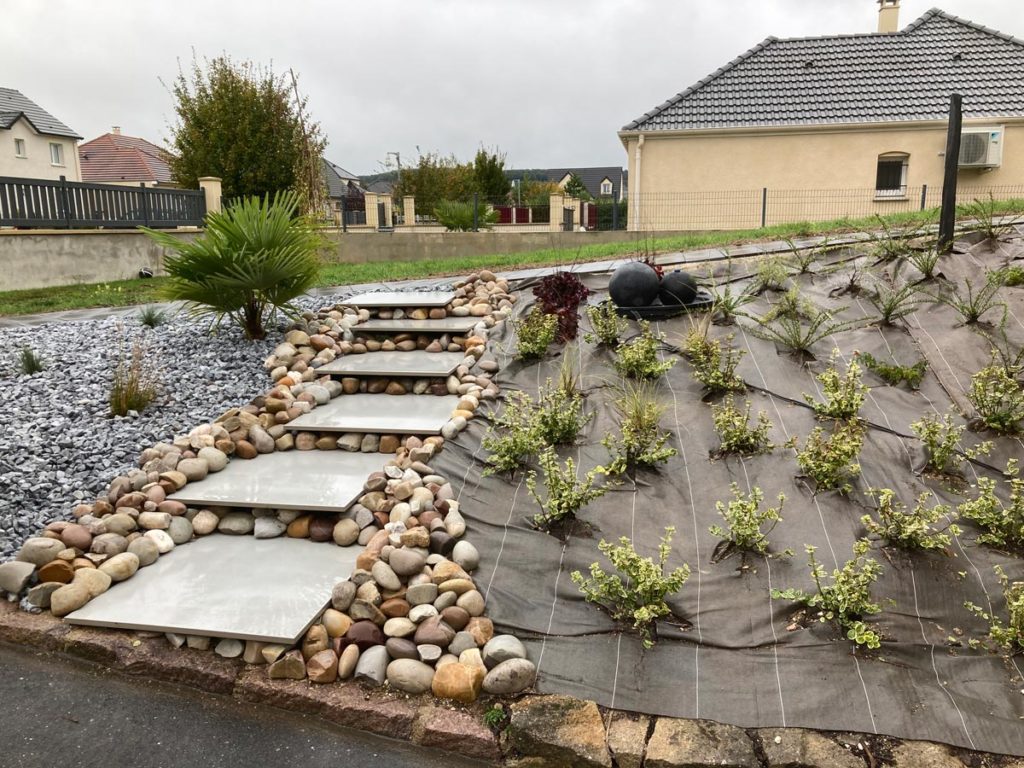 Et nous avons fini par la mise en place de pas japonais en dalle grès cérame.