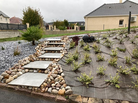 Et nous avons fini par la mise en place de pas japonais en dalle grès cérame.
