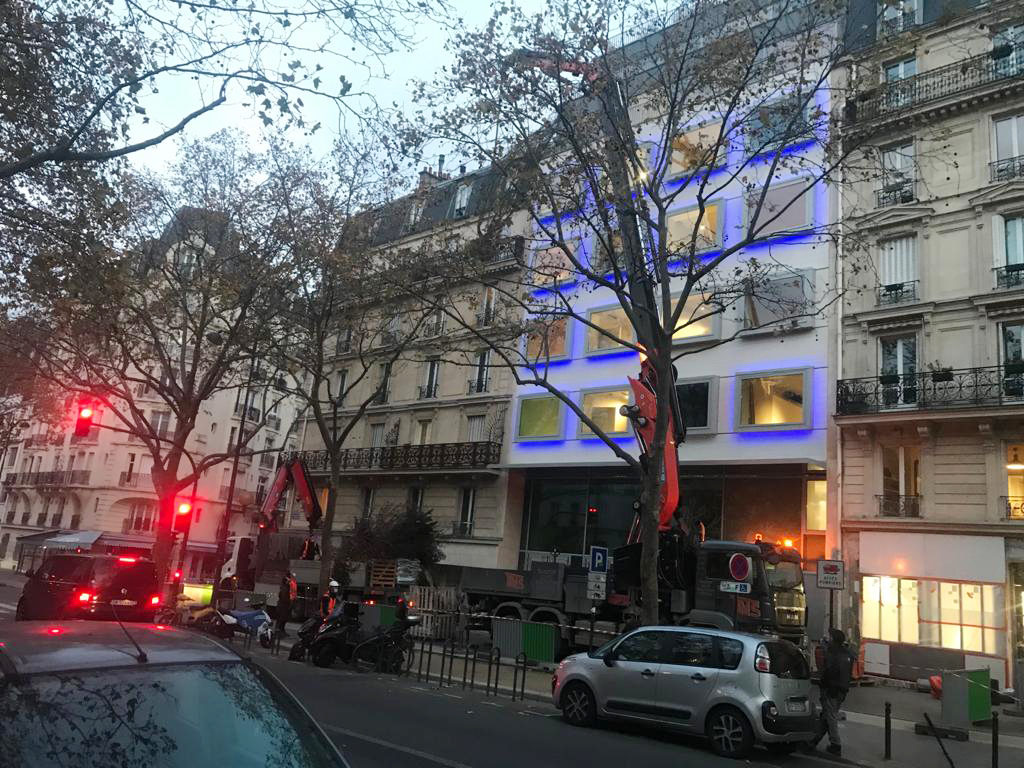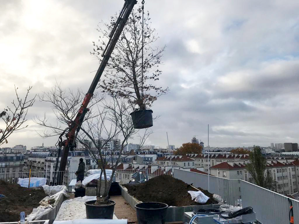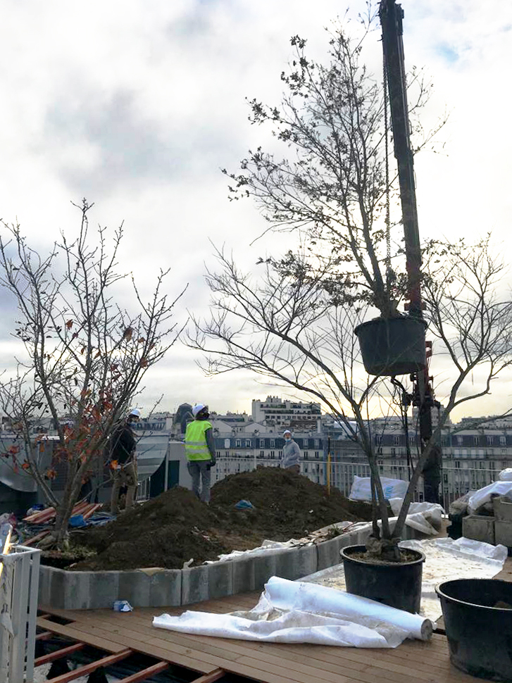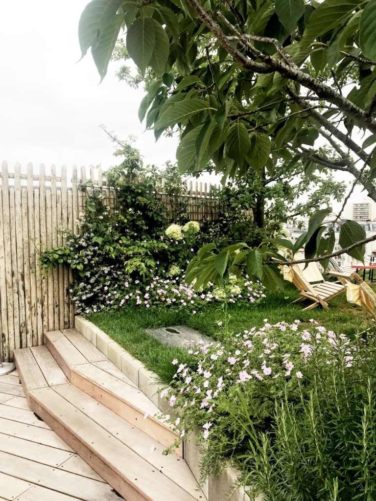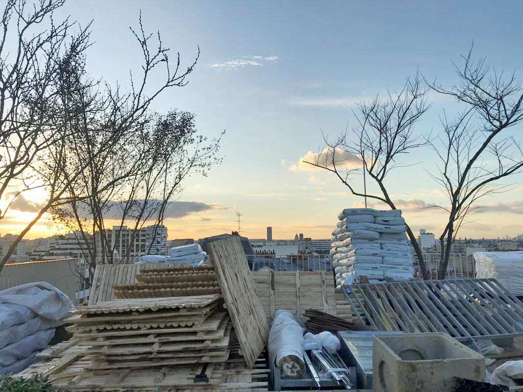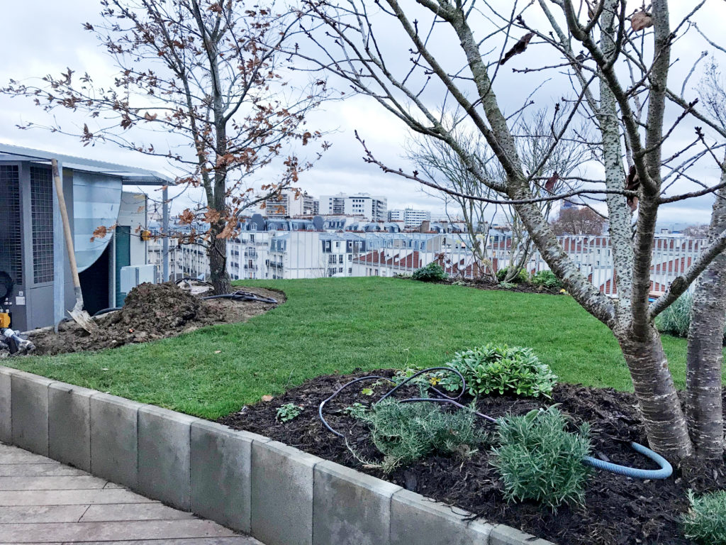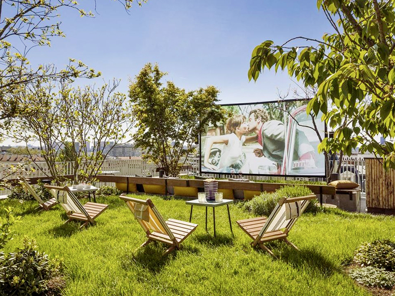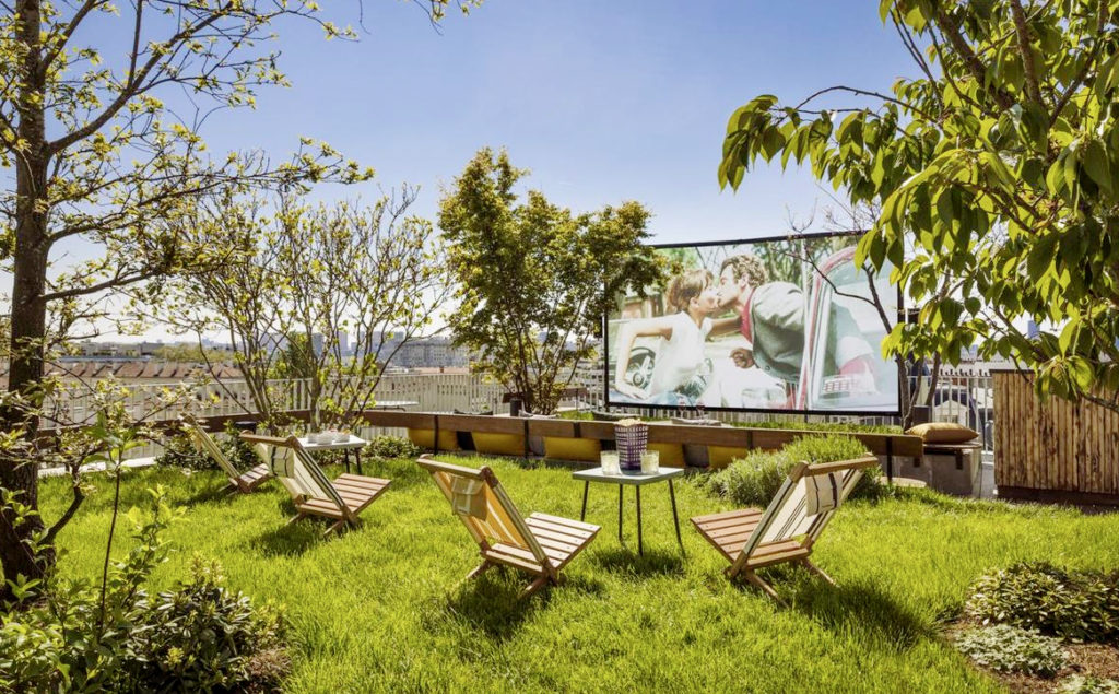 Mission d’étude et pilotage des entreprises pour l’aménagement de ce toit-terrasse du tout premier hôtel cinéma MK2. Pour une expérience inédite, afin de surprendre et charmer les spectateurs privilégiés de ce cinéma en plein air, nous avons imaginé un univers végétal fort perché sur les toits parisiens. Une pelouse en plaquage et un plancher bois en Ipé ont été posés. Un banc conçu en lames de terrasse Ipé a été installé. Enfin une palissade en châtaignier achève d’habiller ce toit-terrasse unique à Paris. Le système d’arrosage automatique comme l’éclairage de cet espace ont été pensés en amont du chantier.
