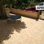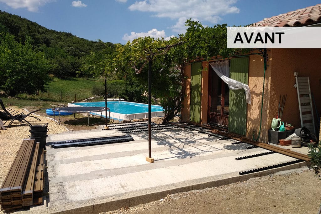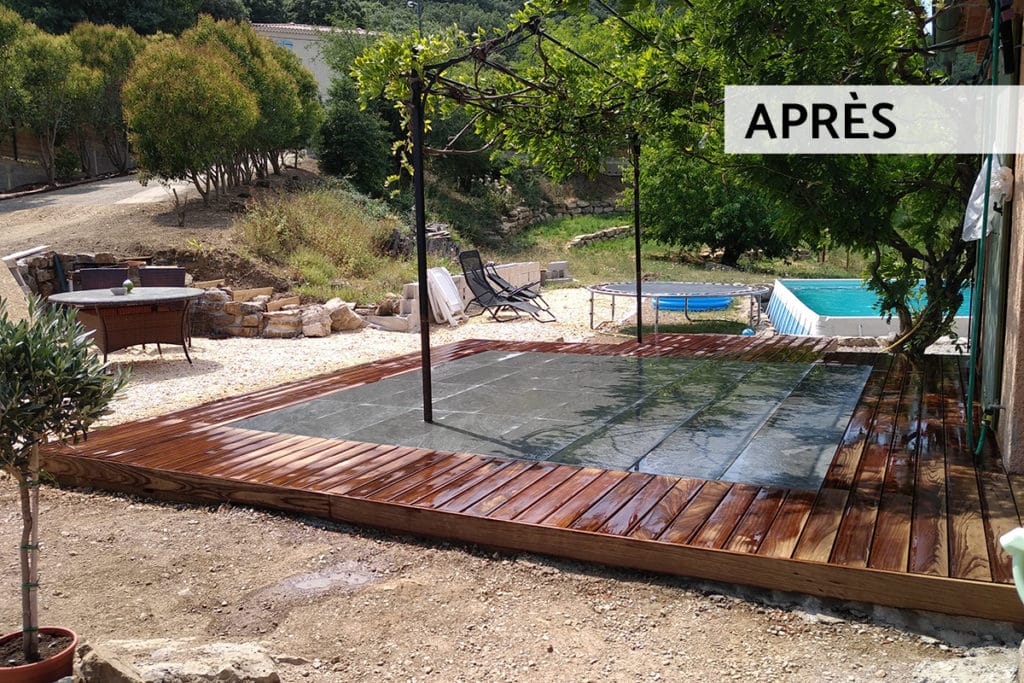 Dans le futur cette terrasse fera partie intégrante d’un aménagement globale reliée à la plage de piscine. Nous avons donc proposé du grès cérame pour la zone repas, habillée en périphérie de bois qui permettra de créer le lien avec la future plage de piscine en bois également.