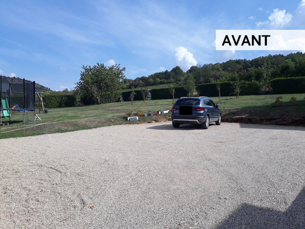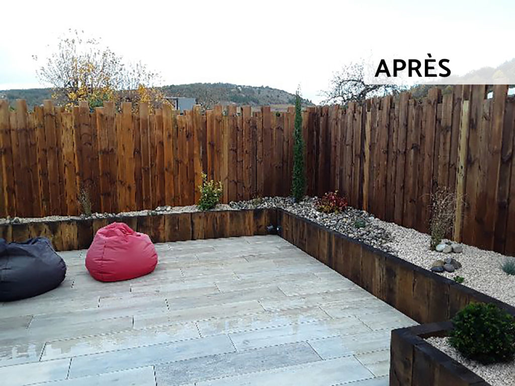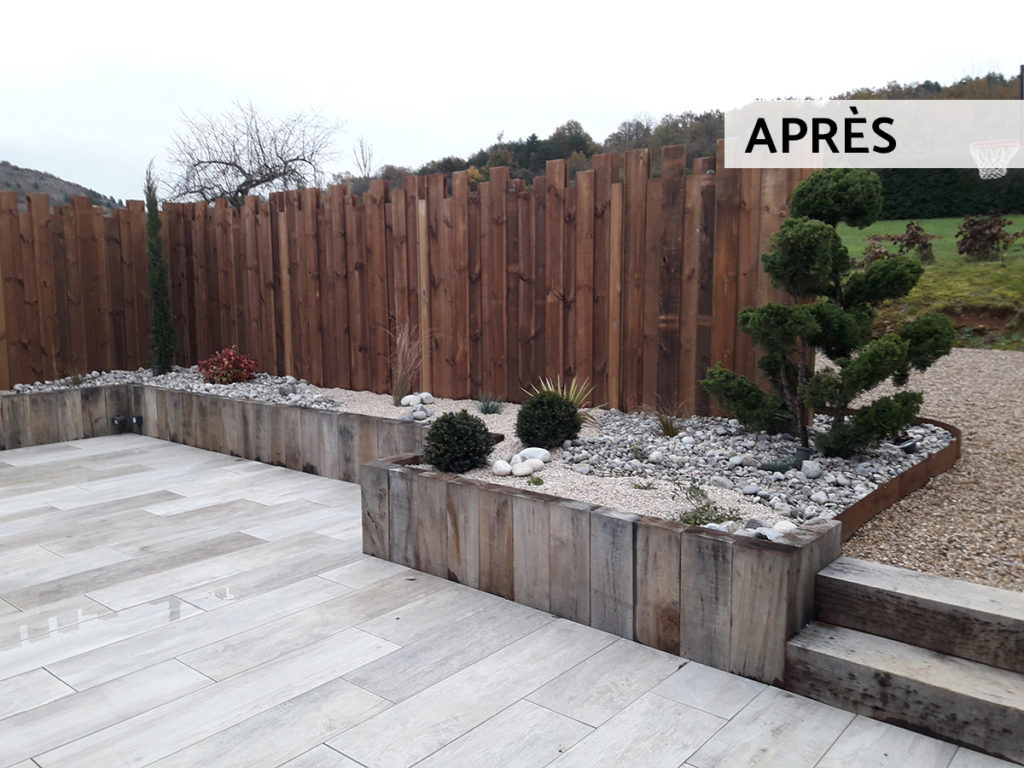 Création d’un espace de vie intime au milieu d’une grande cour. Soutènement et fermeture visuelle grâce à des panneaux bois. Revêtement de sol en grès Céram (afin de faciliter l’entretien) posé sur plots pour permettre l’accès à la machinerie du spa, finition imitation bois. Aménagement paysager « esprit méditerranéen »