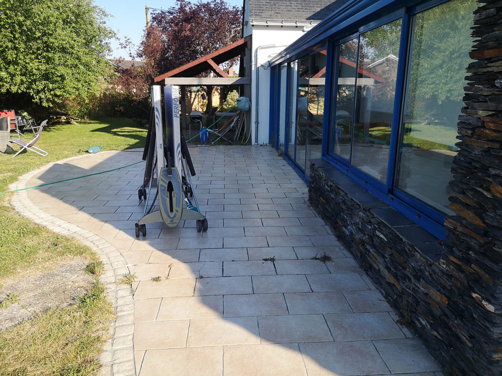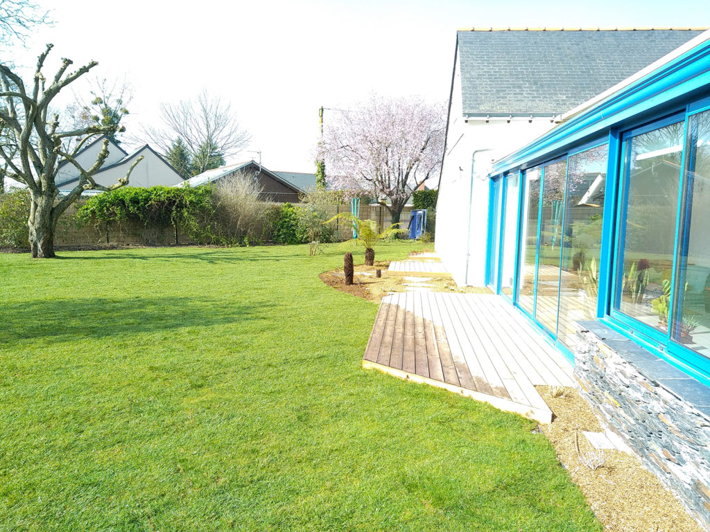 A Corné (49), ce jardin a connue une métamorphose en profondeur : réalisation d’un arrosage intégré, terrasses, Pool House, éclairage, accès pavés, plantations, robot de tonte et décoration. Notre client, ravi du projet attend désormais le printemps avec impatience. Des espaces abrités du soleil, de la pluie, ou à l’inverse plein soleil leurs permettrons de profiter du jardin à tout moment. D’un point de vue dessin, nous avons prit le partie de déplacer la terrasse face à la maison et faire « entrer le végétal dans la véranda » en diminuant la grande terrasse béton.