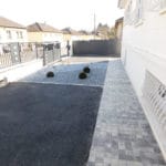 Mise en place d’un portail coulissant et clôture, aménagement d’un massif minéral avec allée en pavés « dune nuancé », palissade et montée en enrobé noir à...
