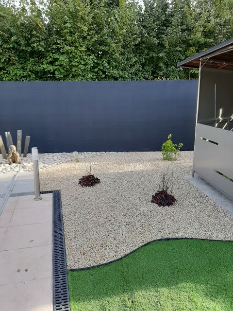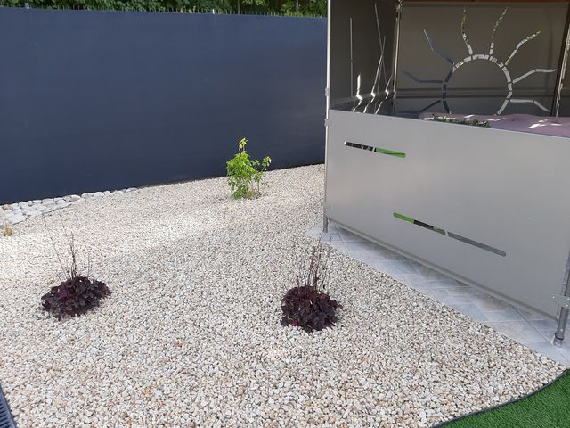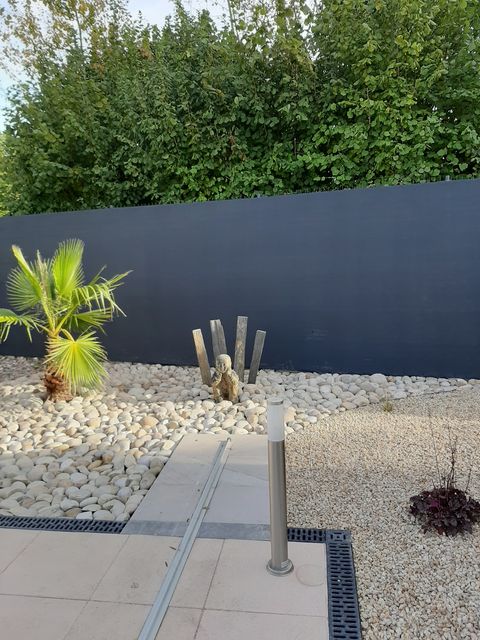 Rien de telle qu’une grande terrasse en grès cérame pour prolonger votre lieux d’habitation. Le massif de vivaces et arbustes avec paillage en gravier quartz...