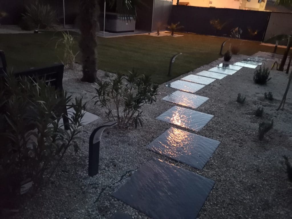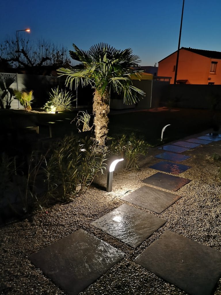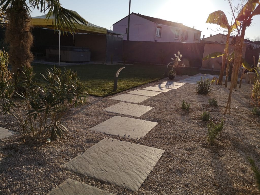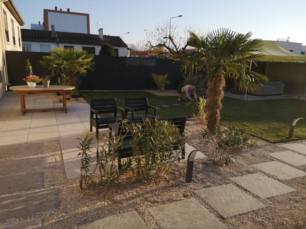 Des plantations de palmiers, bananiers, graminées amènent une touche contemporaine, s’intégrant parfaite au SPA, qui lui a été recouvert d’une verrière. Une clôture composite a également été installé afin d’isolé le jardin des regards. La partie végétale a été terminée par la mise en place d’un gazon en rouleaux. Un éclairage d’ambiance permet de profiter du jardin la nuit.