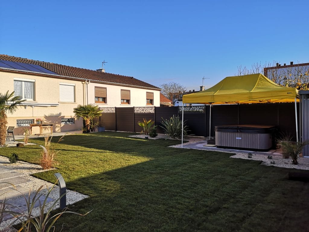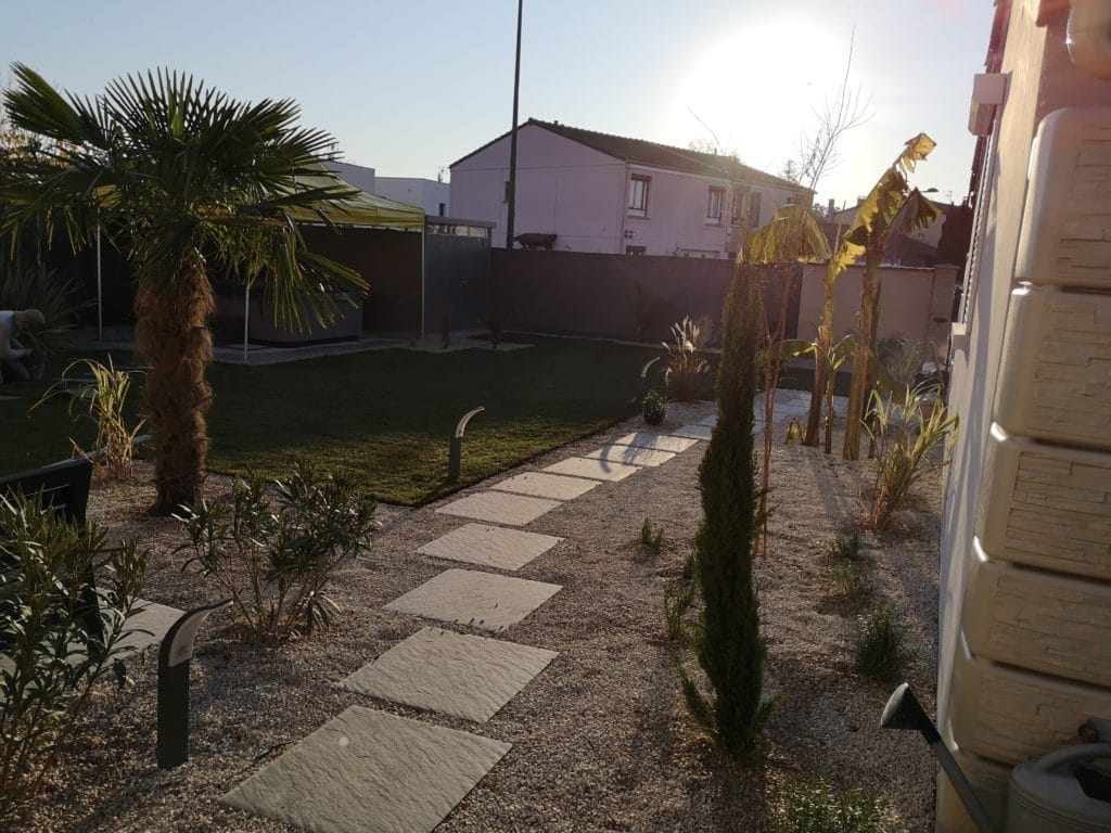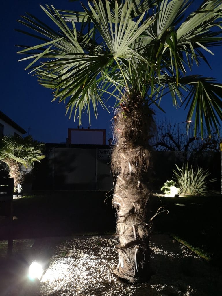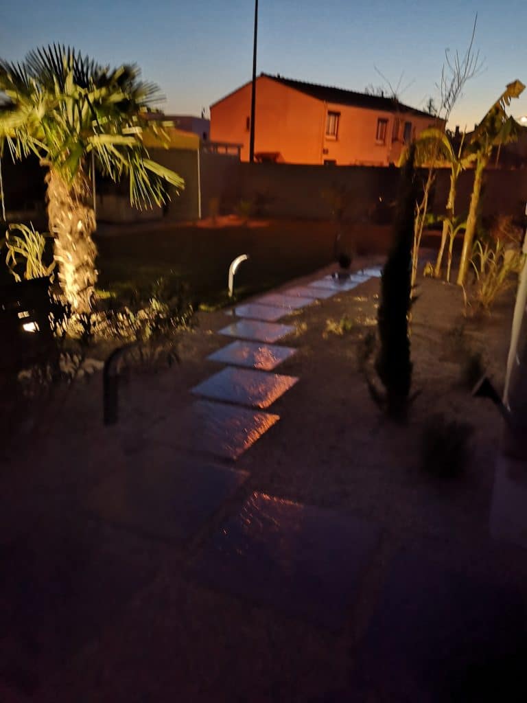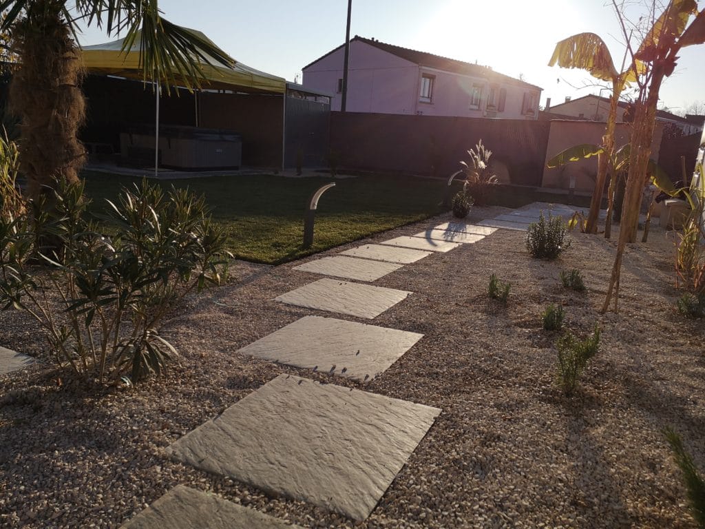 Des plantations de palmiers, bananiers, graminées amènent une touche contemporaine, s’intégrant parfaite au SPA, qui lui a été recouvert d’une verrière. Une clôture composite a également été installé afin d’isolé le jardin des regards. La partie végétale a été terminée par la mise en place d’un gazon en rouleaux. Un éclairage d’ambiance permet de profiter du jardin la nuit.