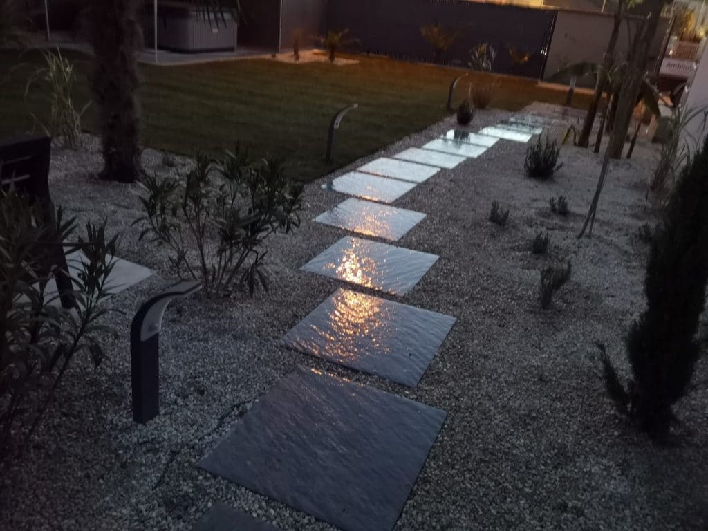 Nous lui avons donc créé 3 terrasses, donc une accueillant le SPA. Des dalles grès cérame 60x60x2cm, facile d’entretien ont donc été employées. Nous avons pu également utiliser ses mêmes dalles, mais d’une teinte différente pour créer une allée souple en pas japonais entouré de graviers décoratifs.